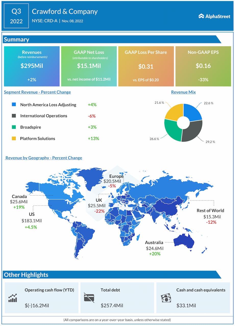 Crawford & Company (NYSE: CRD-A) reported revenues before reimbursements of $294.9 million for the third quarter of 2022, up 2% year-over-year.