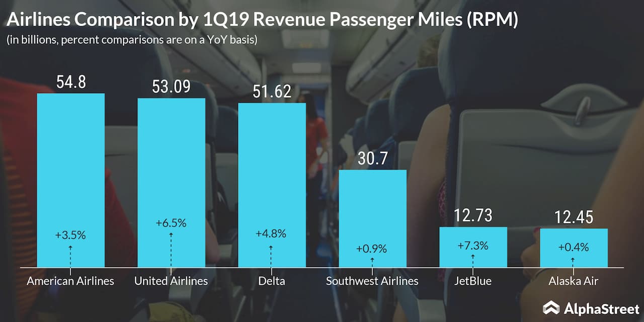 Based on data from the Bureau of Transportation, as of March 2019, JetBlue stood at the sixth position in terms of revenue passenger miles (RPM) with a 5.6% share, trailing behind the rest of its aforementioned competitors. American topped the chart in this metric.