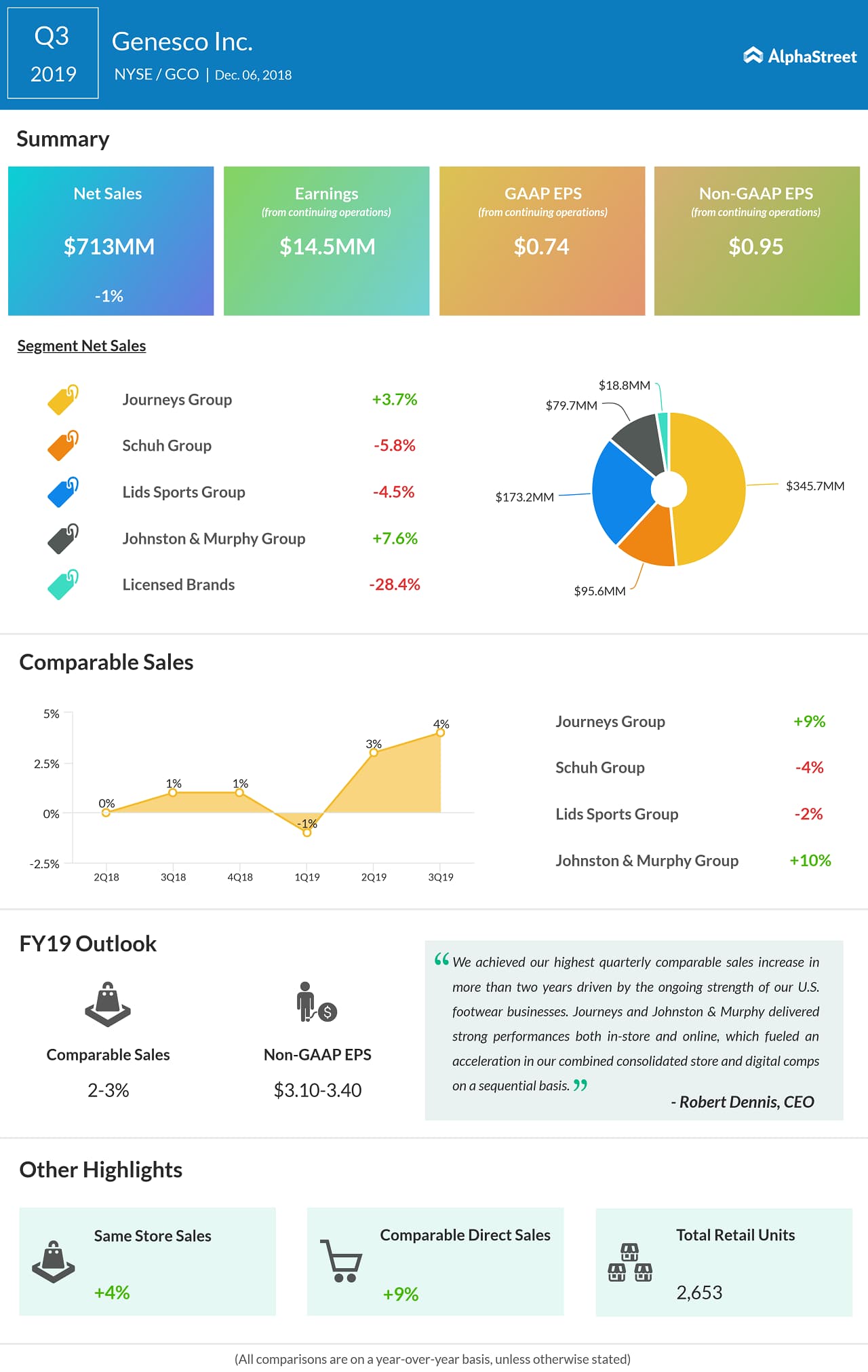Last quarter, Genesco beat market expectations on revenue and earnings. Net sales then soared 6% to $654 million while, total comparable sales rose 3%, reflecting the highest gain in over two years.
