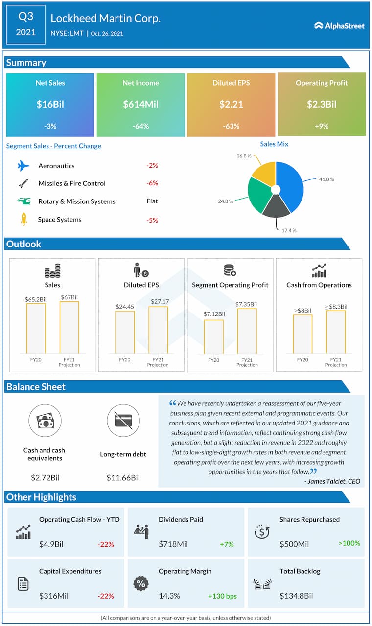 Lockheed Martin Corporation (NYSE: LMT) reported net sales of $16 billion for the third quarter of 2021.