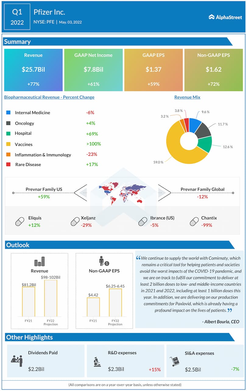 Pfizer Inc. (NYSE: PFE) reported first quarter 2022 earnings results today.